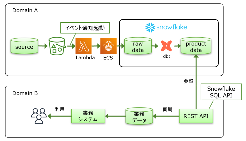 ※2 … Snowflakeの参照用ロールを他ドメインチームのユーザーへ付与し、SnowflakeのSQL REST APIでデータを取得、利用