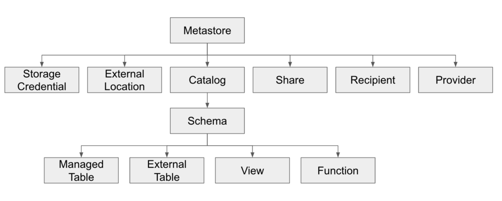 - UnityCatalogで権限設定が可能なオブジェクトは階層構造になっており、以下の図(公式ドキュメントより)のとおり、Catalogの下層にSchemaがありその下にマネージドテーブル、外部テーブル、View、Functionとなっている