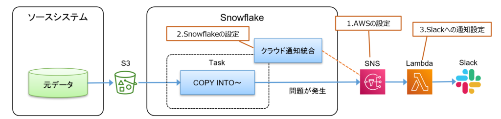 - SnowflakeのタスクやSnowpipeでエラーが発生した場合、Snowflakeのクラウド通知統合でクラウドのメッセージ通知サービスと連携することでSlackやメールなどにエラー通知を行うことができます。本稿ではAWSのSNSでSlackへエラー通知する場合の設定手順を例示します